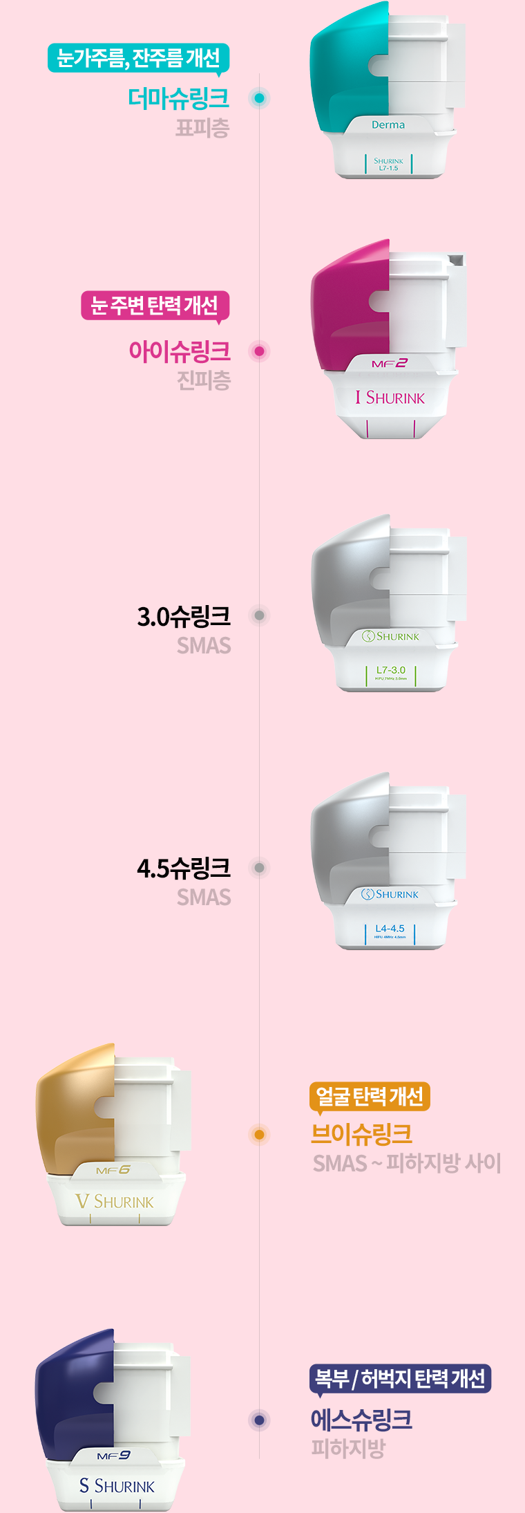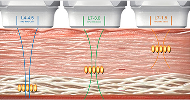 피부 두께에 따른 다른 카트리지를 사용하여 표피, 진피, 섬유근막층에