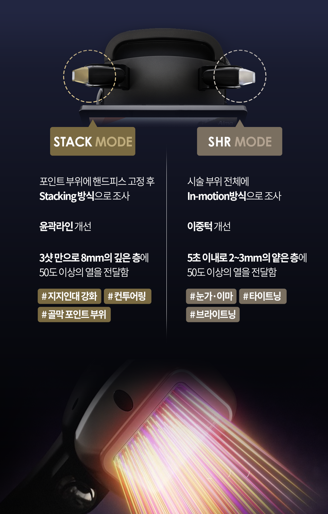타이트닝 모드 - 이마ㆍ윤곽라인, 리프팅 모드 - 눈가ㆍ팔자,